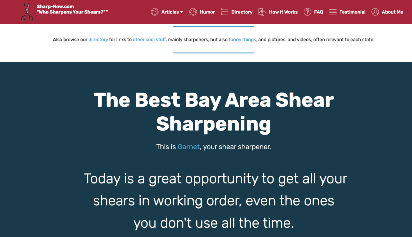 I have been sharpening shears in the San Francisco Bay area, and in 14 other states, for almost ten years. I am very experienced with a gentle machine and a top notch process that makes your shears better than they were new. Call me for sharpening today! I do the sharpening on-site, no need to send your shears away on long vacations. With me, you can have your perfect shears back in just a few minutes.